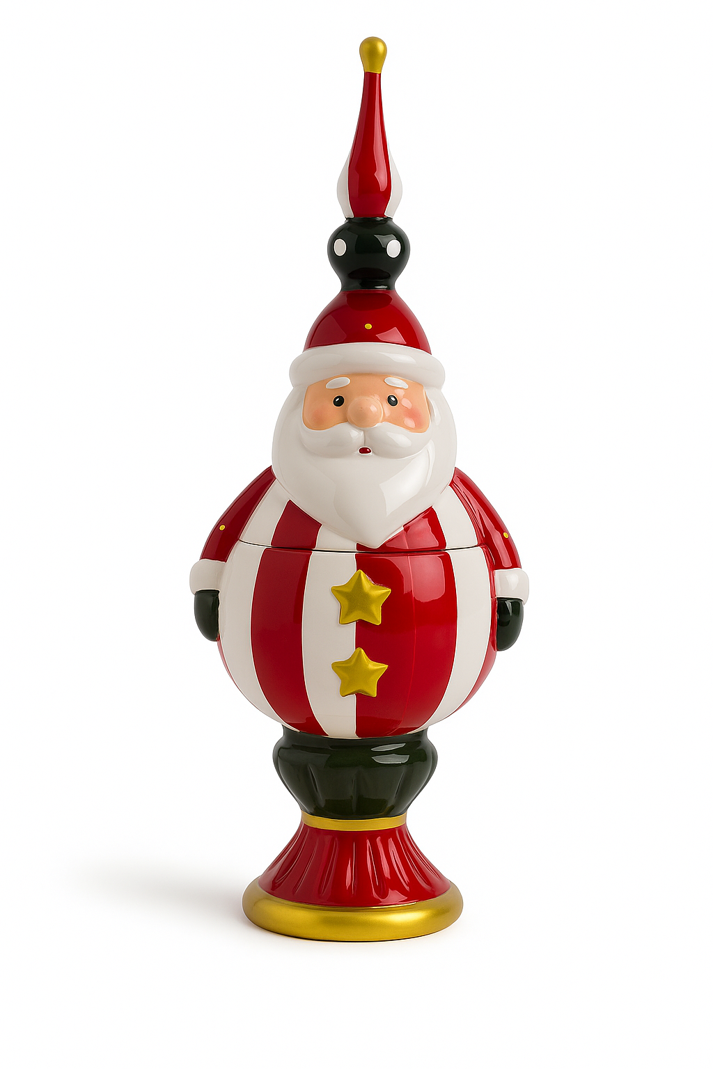 Die Goldline Weihnachtsmann Keksdose ist ein festlicher Blickfang und zugleich eine praktische Aufbewahrung für die Advents- und Weihnachtszeit. Gefertigt aus hochwertiger Keramik und mit liebevollen Details gestaltet, verbindet sie Funktionalität mit nostalgischem Weihnachtscharme.