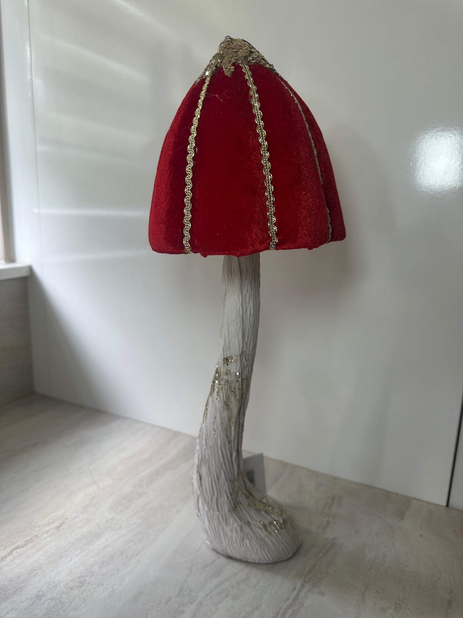 Der rote Samthut verleiht dem Pilz eine luxuriöse Tiefe, während die weißen Punkte mit goldenem Glitzer für funkelnde Highlights sorgen. Der weiße Stiel bildet einen stilvollen Kontrast und rundet das Design harmonisch ab. Ob einzeln präsentiert oder mit weiteren Pilzen kombiniert – dieser Deko-Pilz bringt eine märchenhafte, festliche Note in Ihr Zuhause.