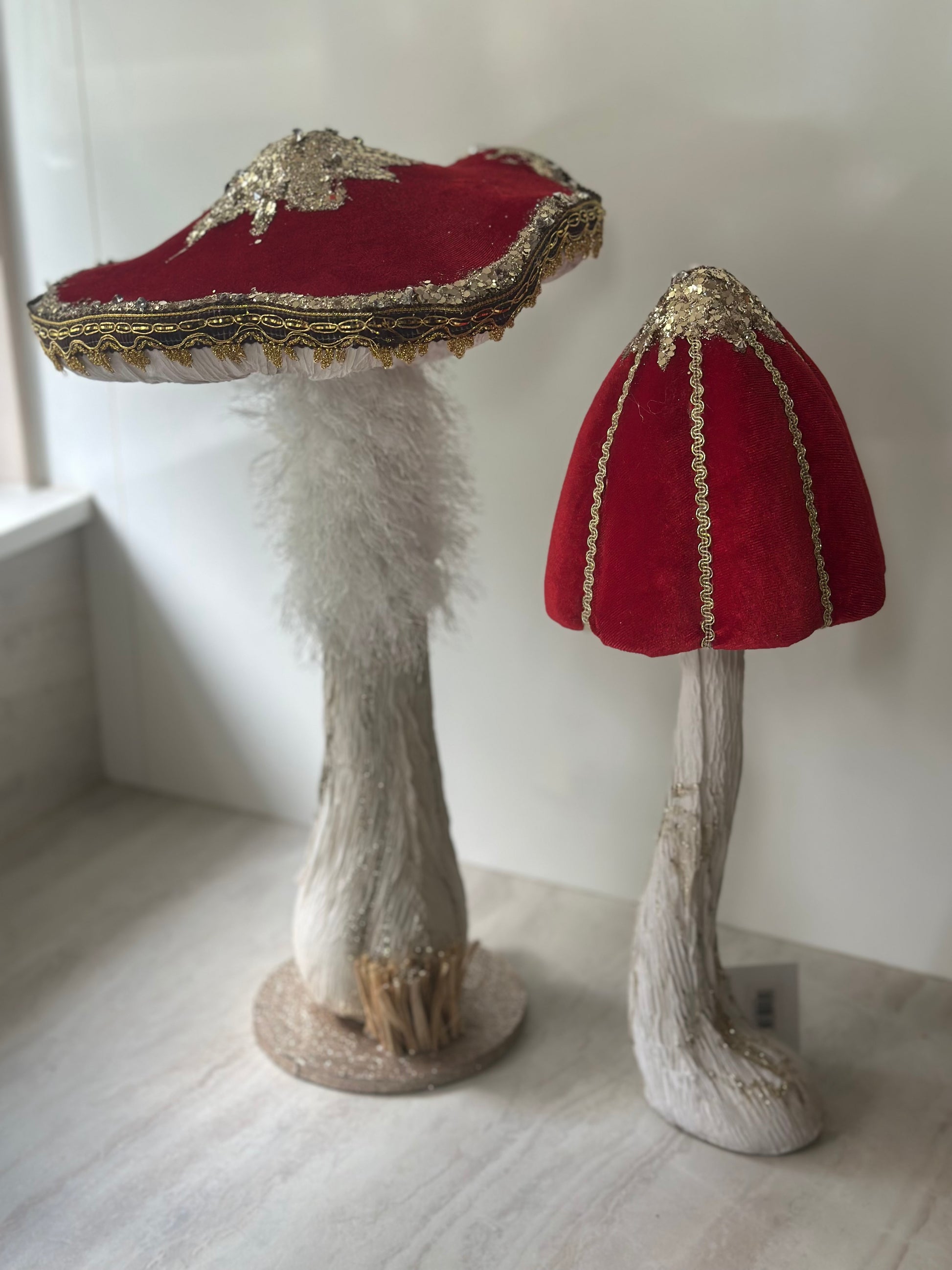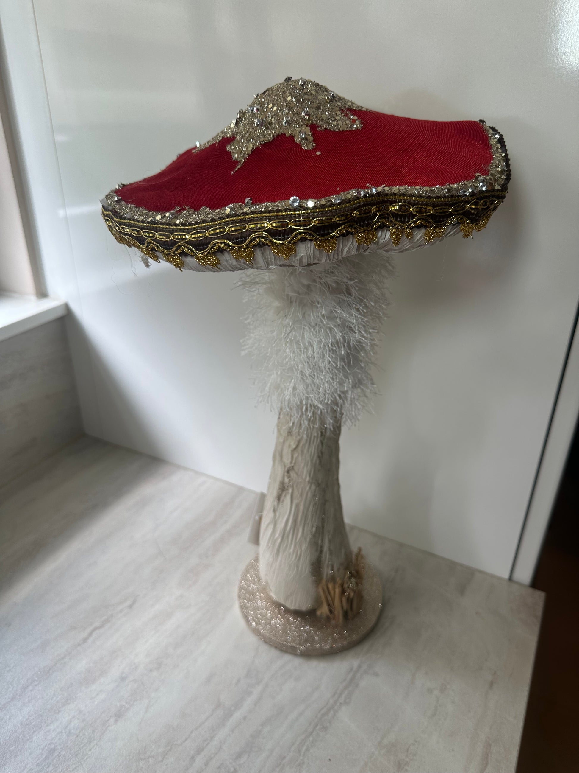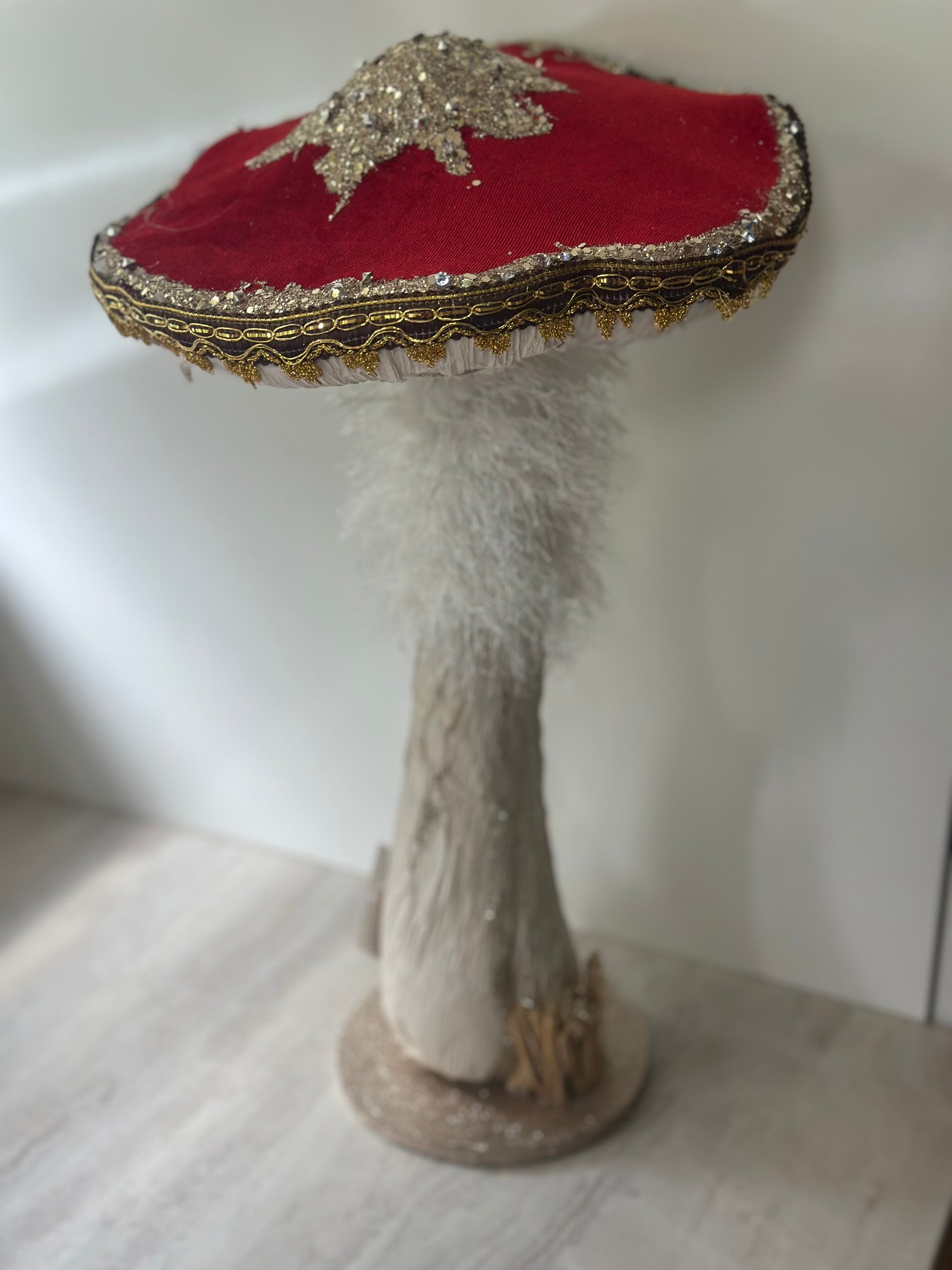 Der rote Samthut wirkt besonders edel und wird durch weiße Punkte mit goldenem Glitzer stilvoll veredelt. Der weiße Stiel rundet das Design harmonisch ab und sorgt für einen märchenhaften, zugleich luxuriösen Look. Ob einzeln platziert oder in Kombination mit weiteren Pilzen und Dekoelementen – dieser Pilz verleiht Ihrer Deko einen verspielten, festlichen Charakter.