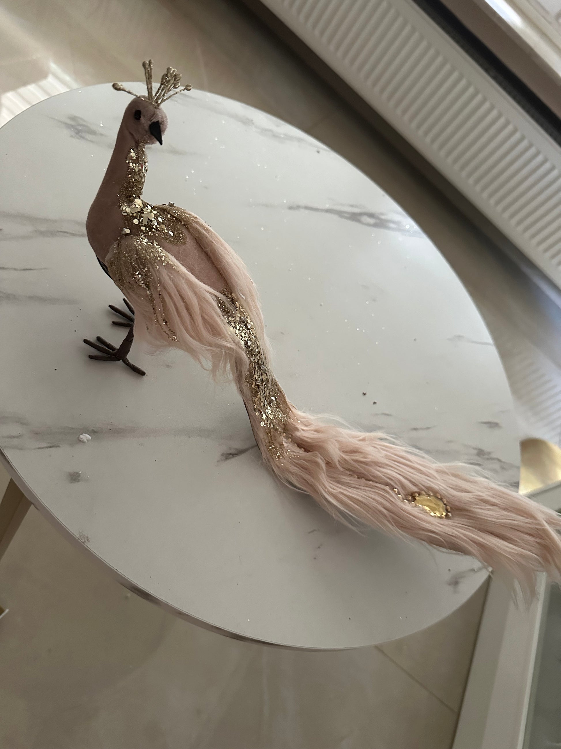 Mit einer Größe von 19 x 14 x 45 cm ist der Vogel ein eindrucksvoller Blickfang auf Sideboards, Fensterbänken, Tischen oder in weihnachtlichen Arrangements. Die sanften Pastelltöne harmonieren perfekt mit modernen, romantischen und glamourösen Dekostilen.