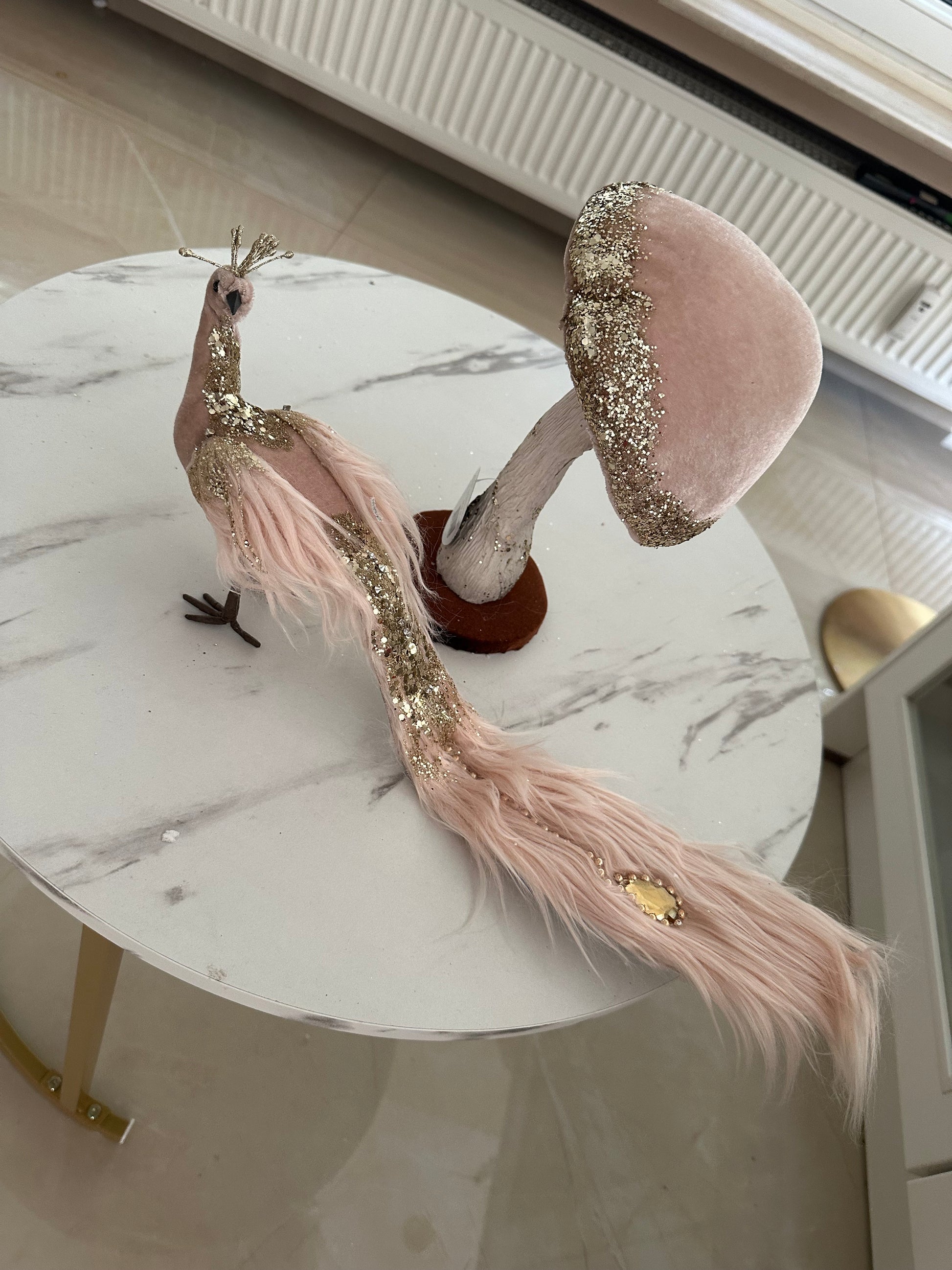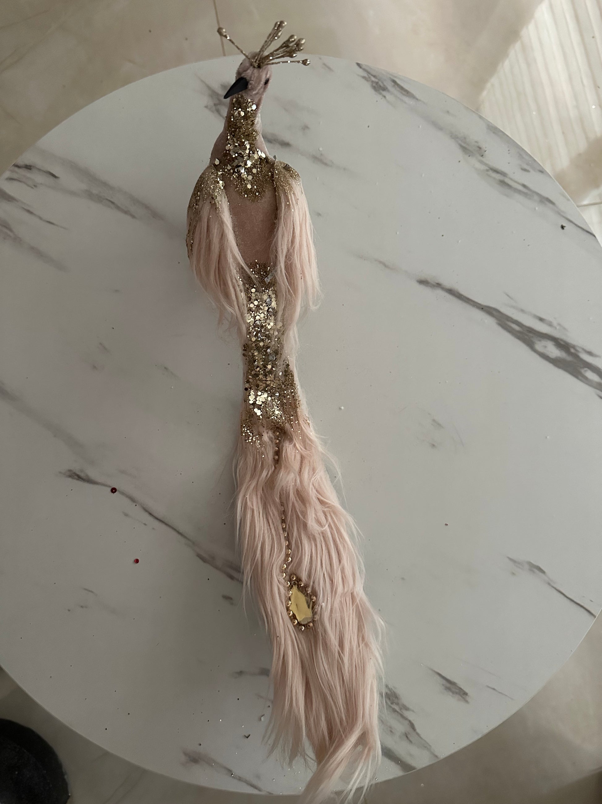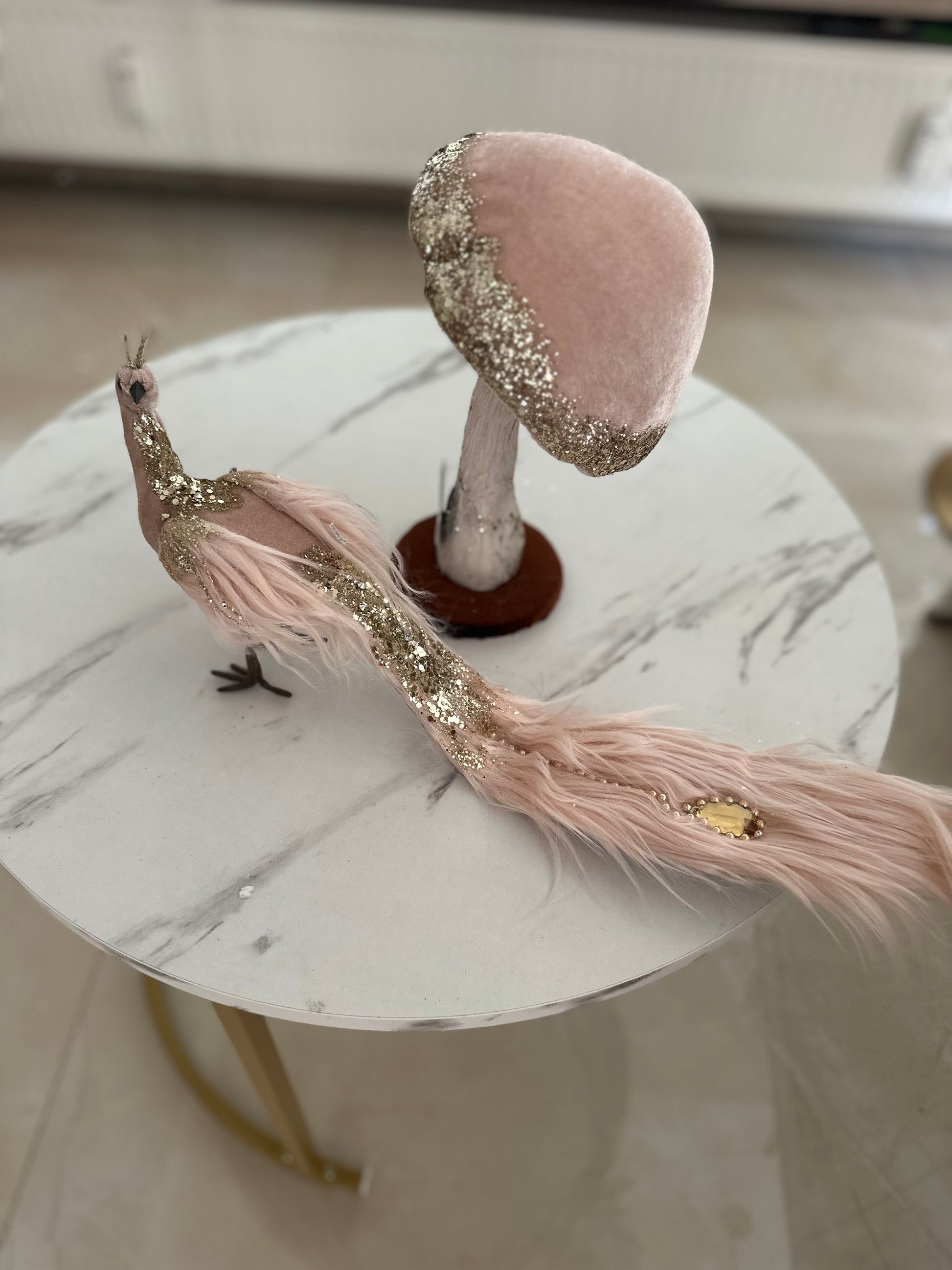 Goldline Deko Vogel aus Samt – Hellrosa mit Kunstfell & Glitzer (19 x 14 x 45 cm)