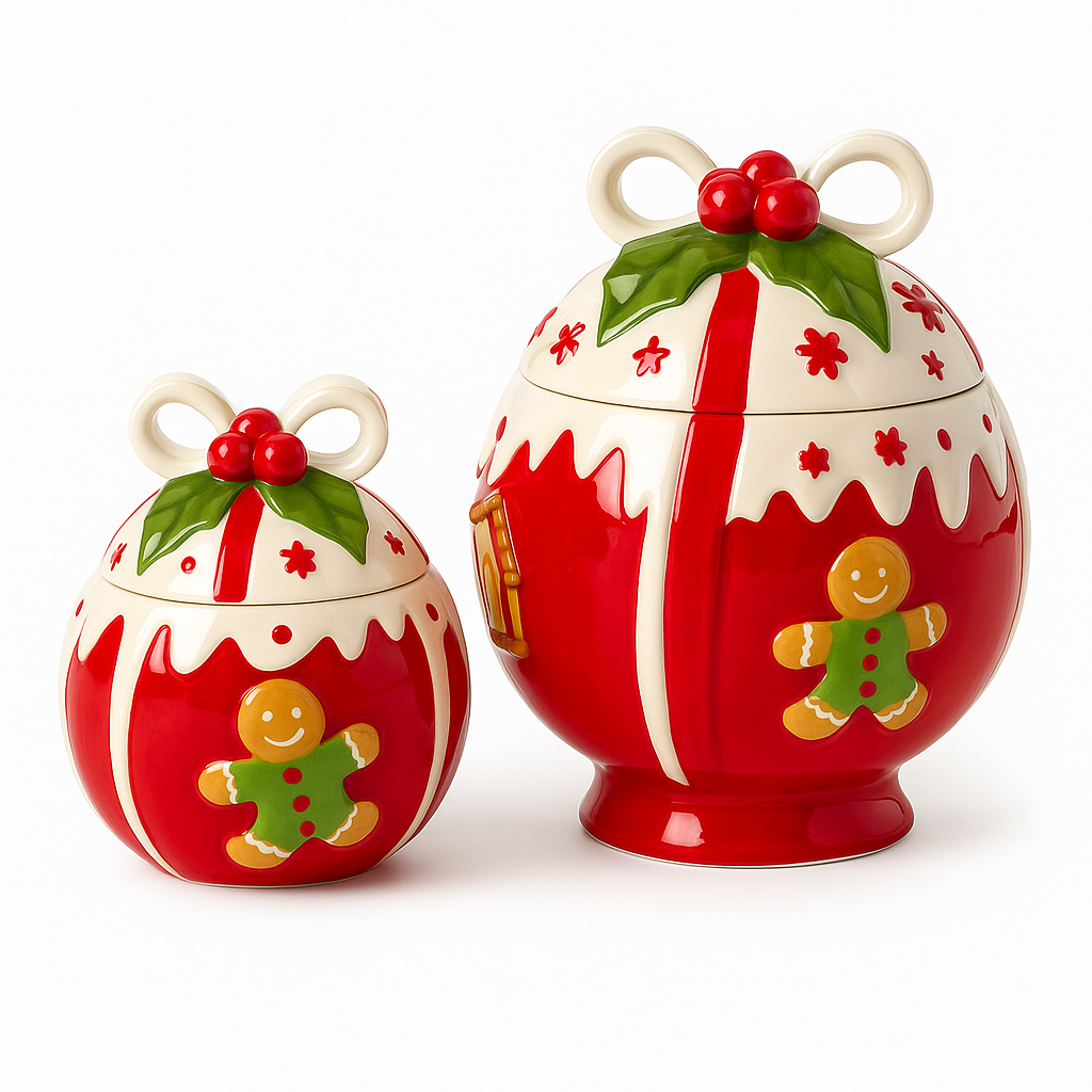 Goldline Candy Keksdosen Kugelform – Rot-Weiß-Grün mit Lebkuchen-Details (Keramik, 2 Größen)