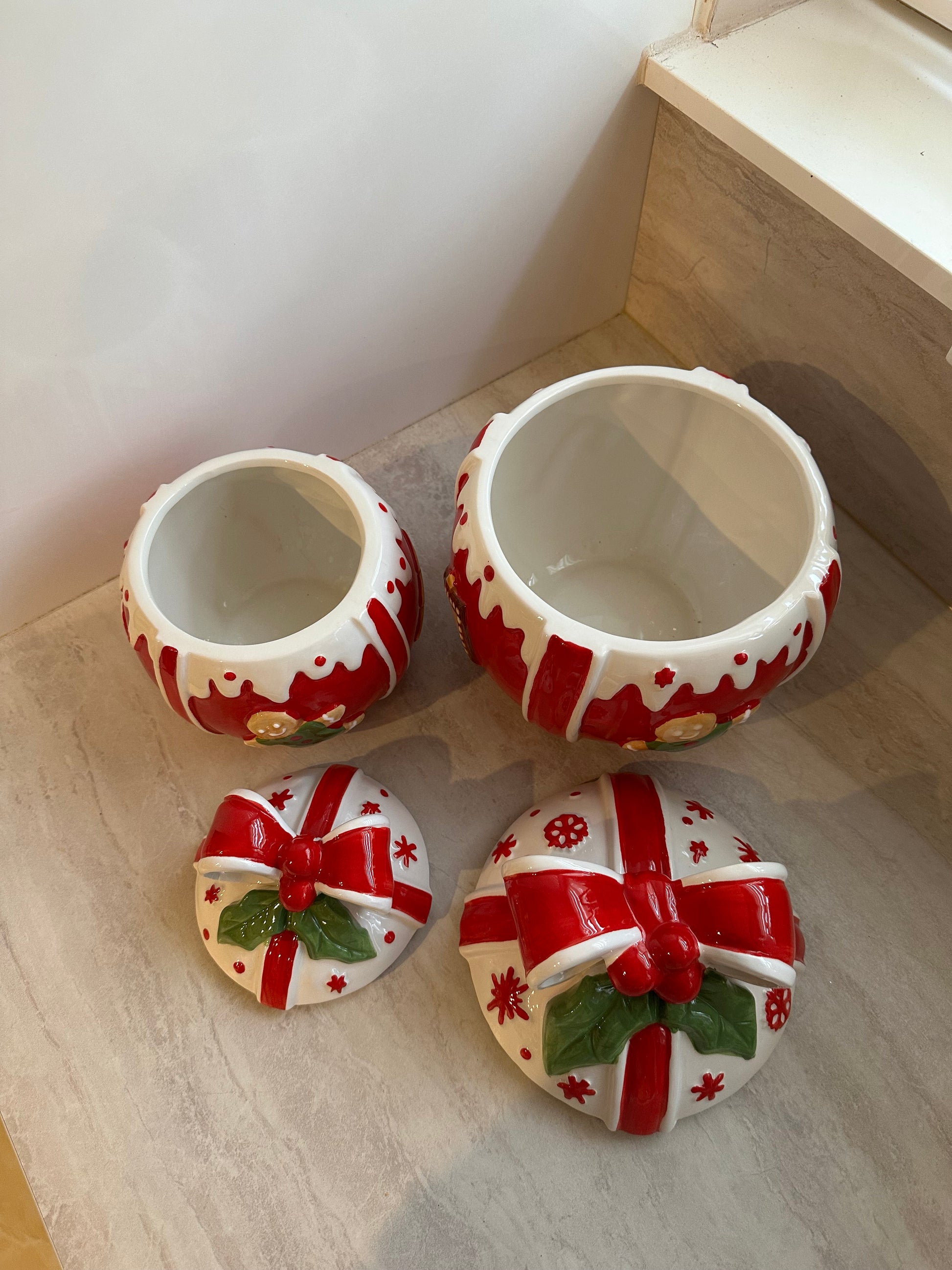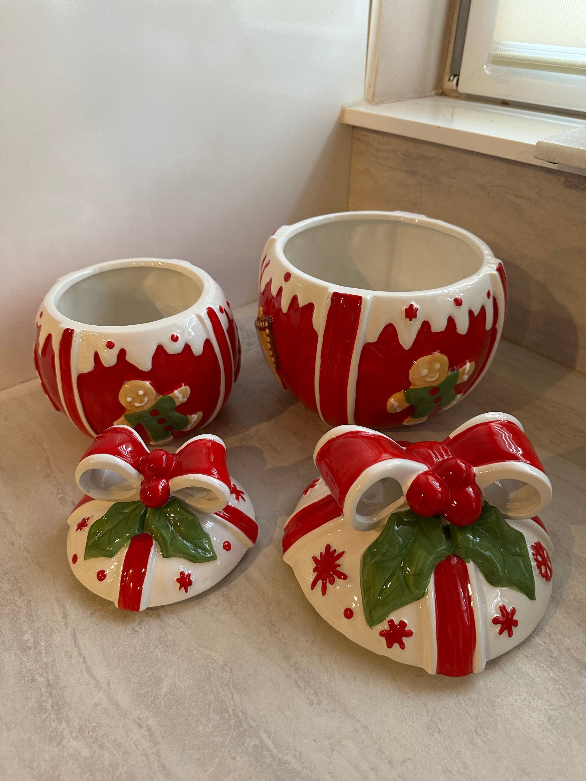 Goldline- Keksdosen/Aufbewahrung Kugel Form rot-weiß-grün mit Lebkuchen und Candy Details in 2 Größen 15cm x 18cm, 19cm x 23cm Keramik