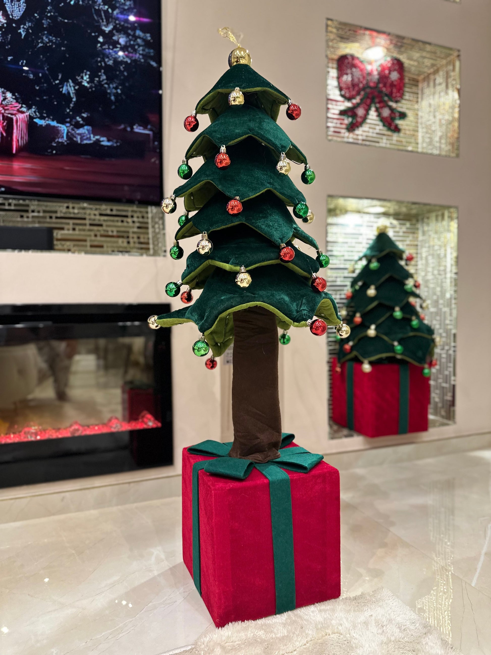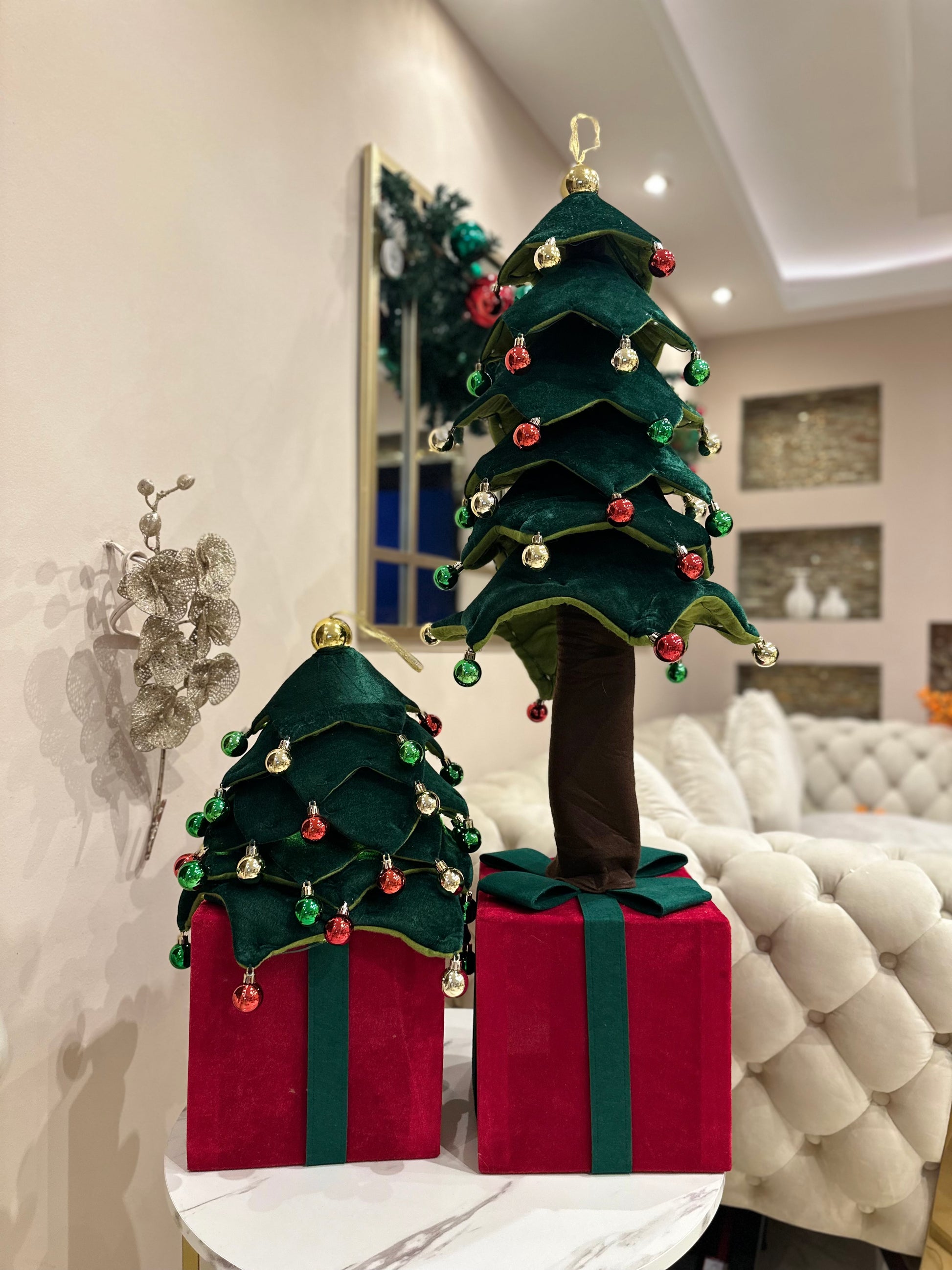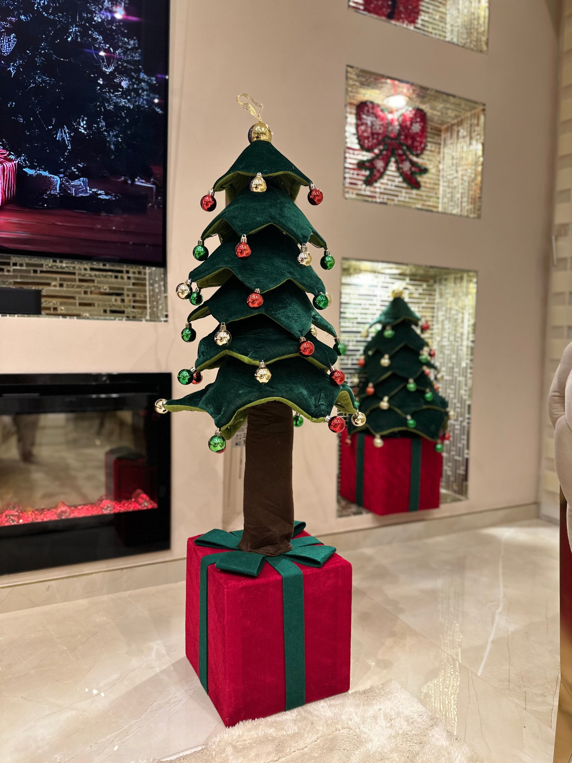 Der Baum besteht aus grünem Samtstoff und ist mit eleganten Dekokugeln in Rot, Gold und Grün geschmückt. Der stabile Fuß in Form eines roten Geschenks mit grünem Band verleiht dem Deko-Baum einen besonderen Charme.