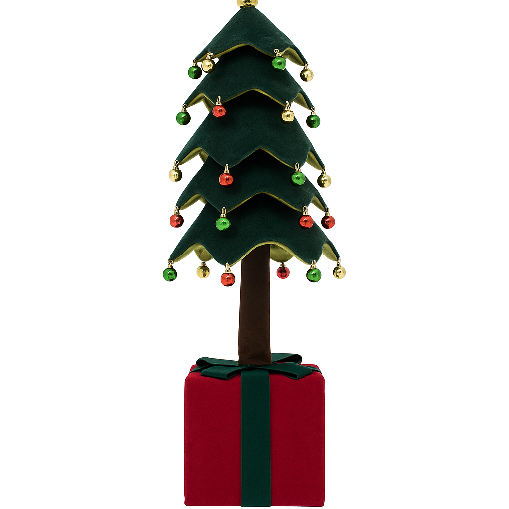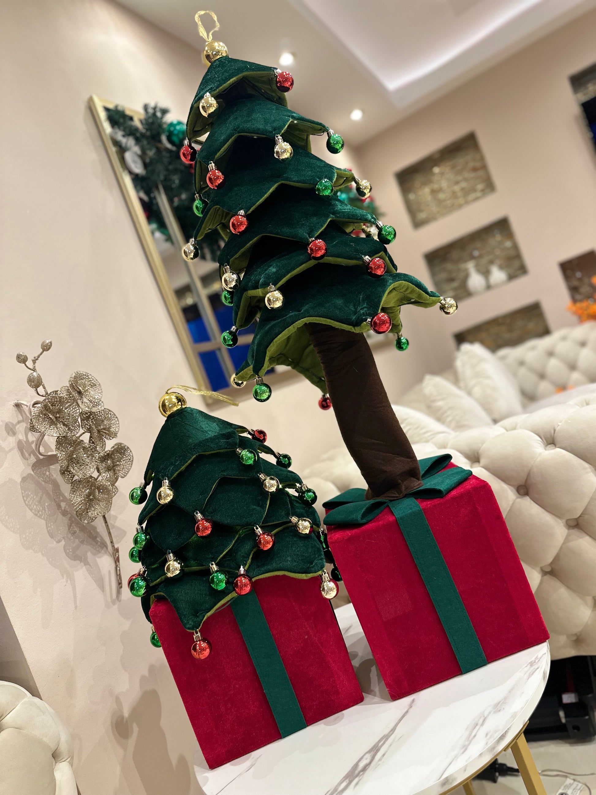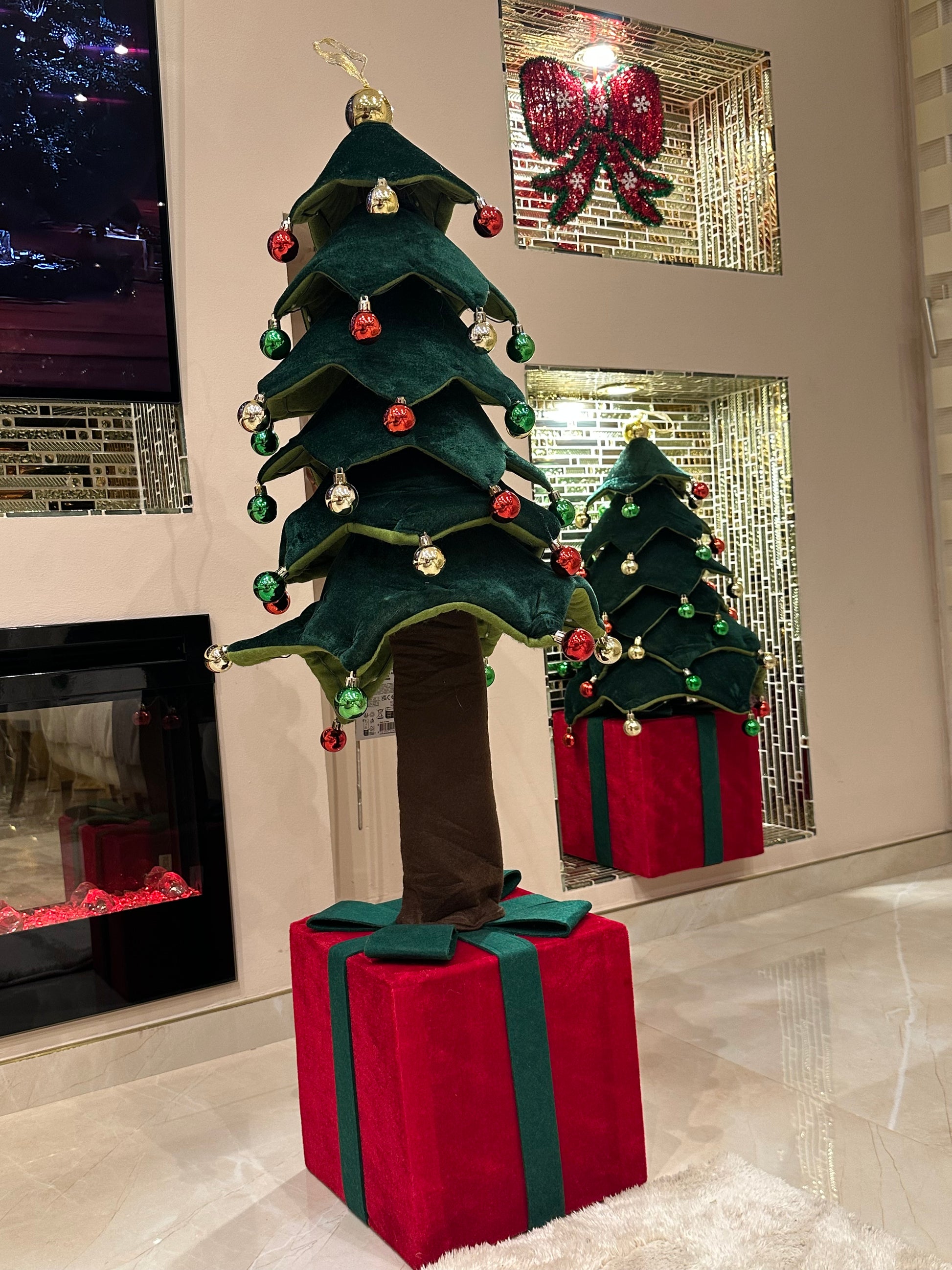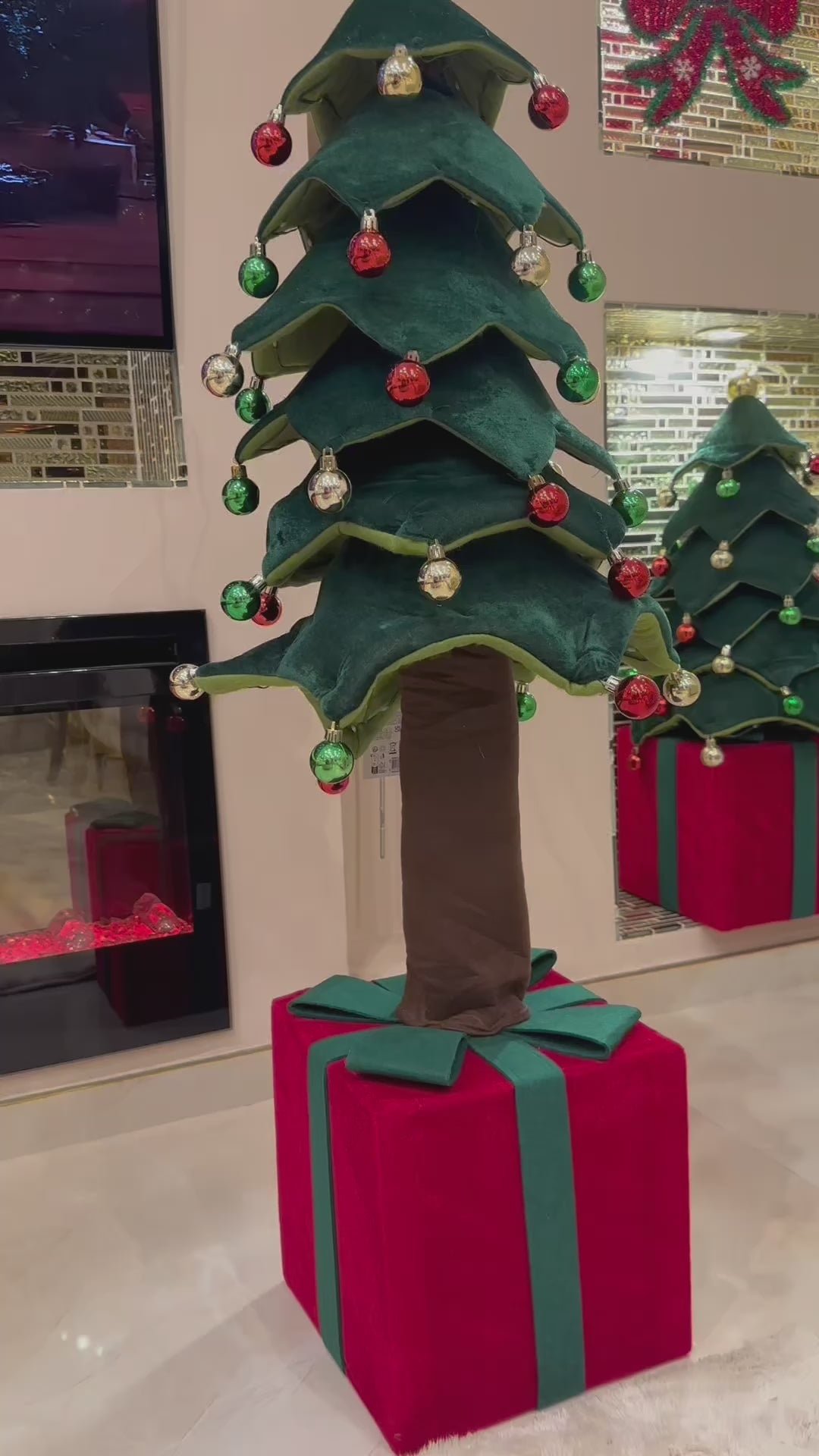 Der Baum besteht aus grünem Samtstoff und ist mit eleganten Dekokugeln in Rot, Gold und Grün geschmückt. Der stabile Fuß in Form eines roten Geschenks mit grünem Band verleiht dem Deko-Baum einen besonderen Charme.
