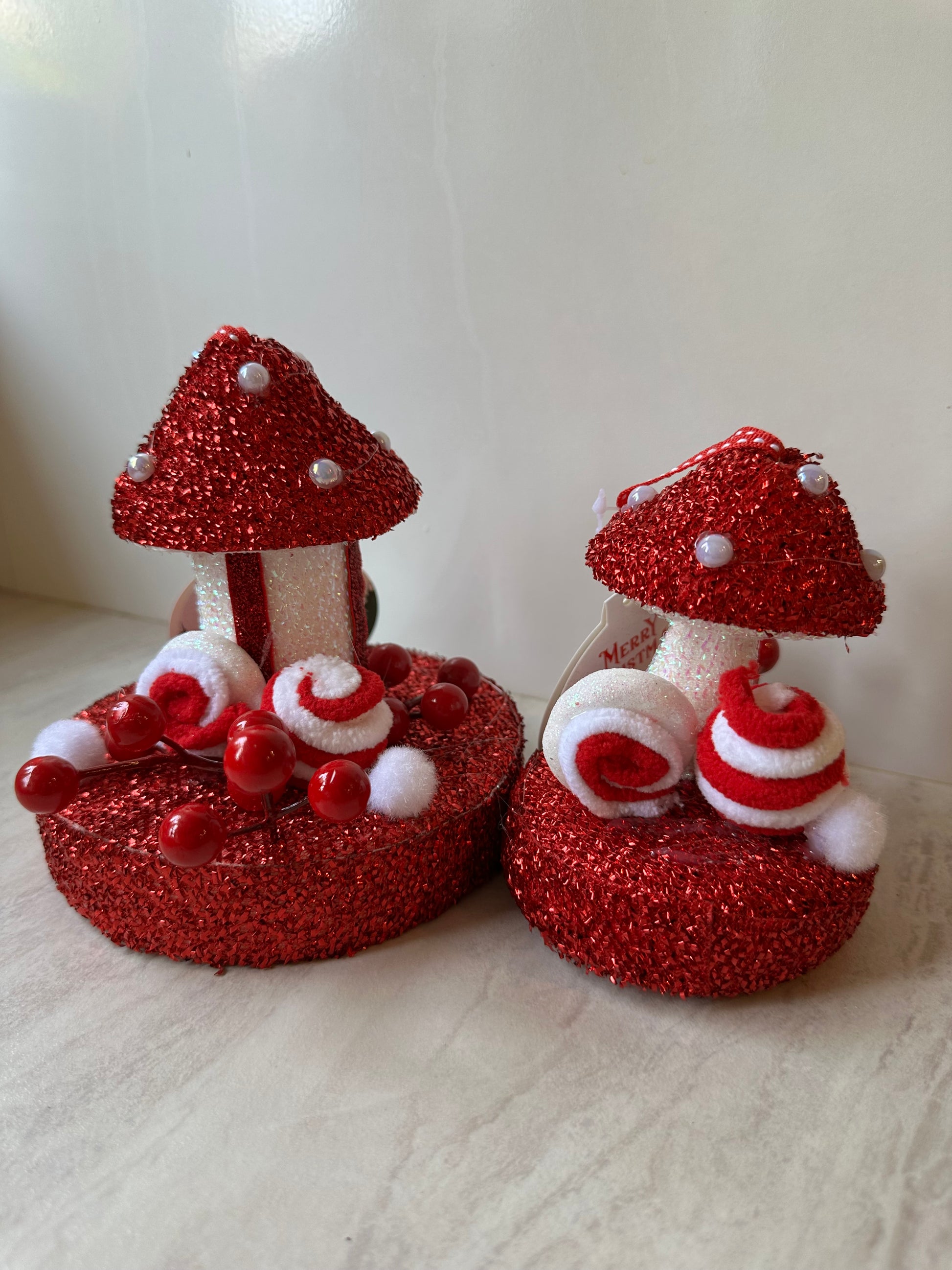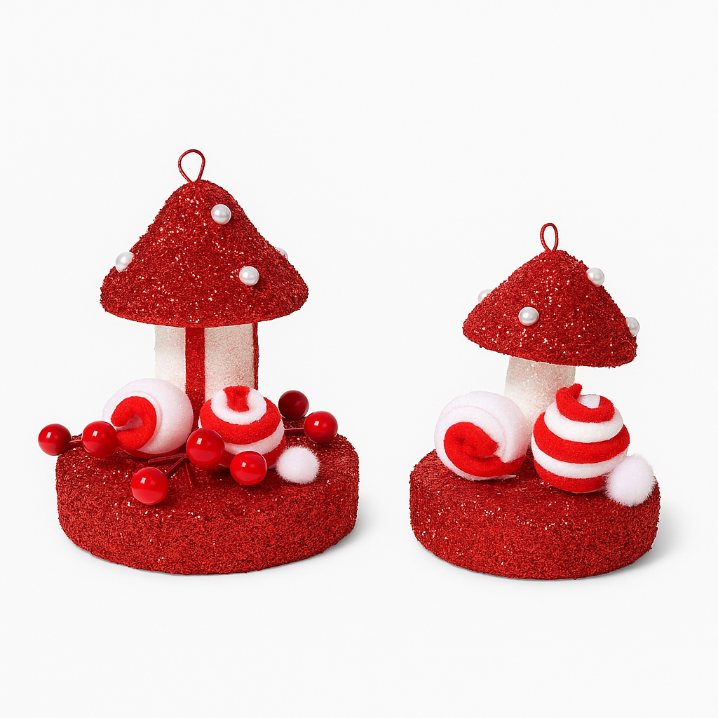 Dank der integrierten Aufhänger lassen sich die Pilze leicht anbringen und flexibel dekorieren – ob am Christbaum, als Blickfang in winterlichen Arrangements oder als niedliche Ergänzung zu Candy- und Schneemann-Dekoren.