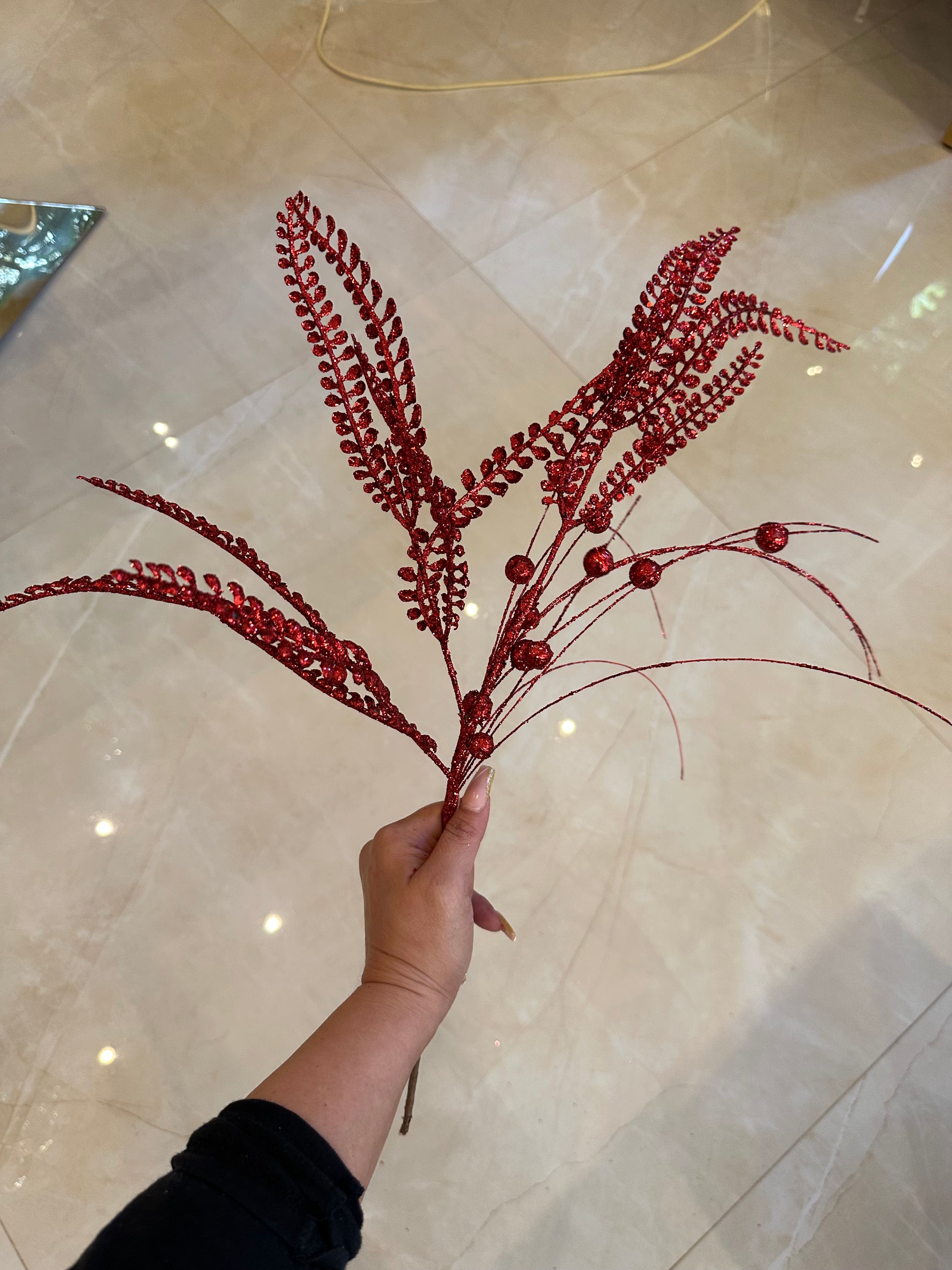 ✅ Hochwertiger Glitzerzweig in klassischem Rot