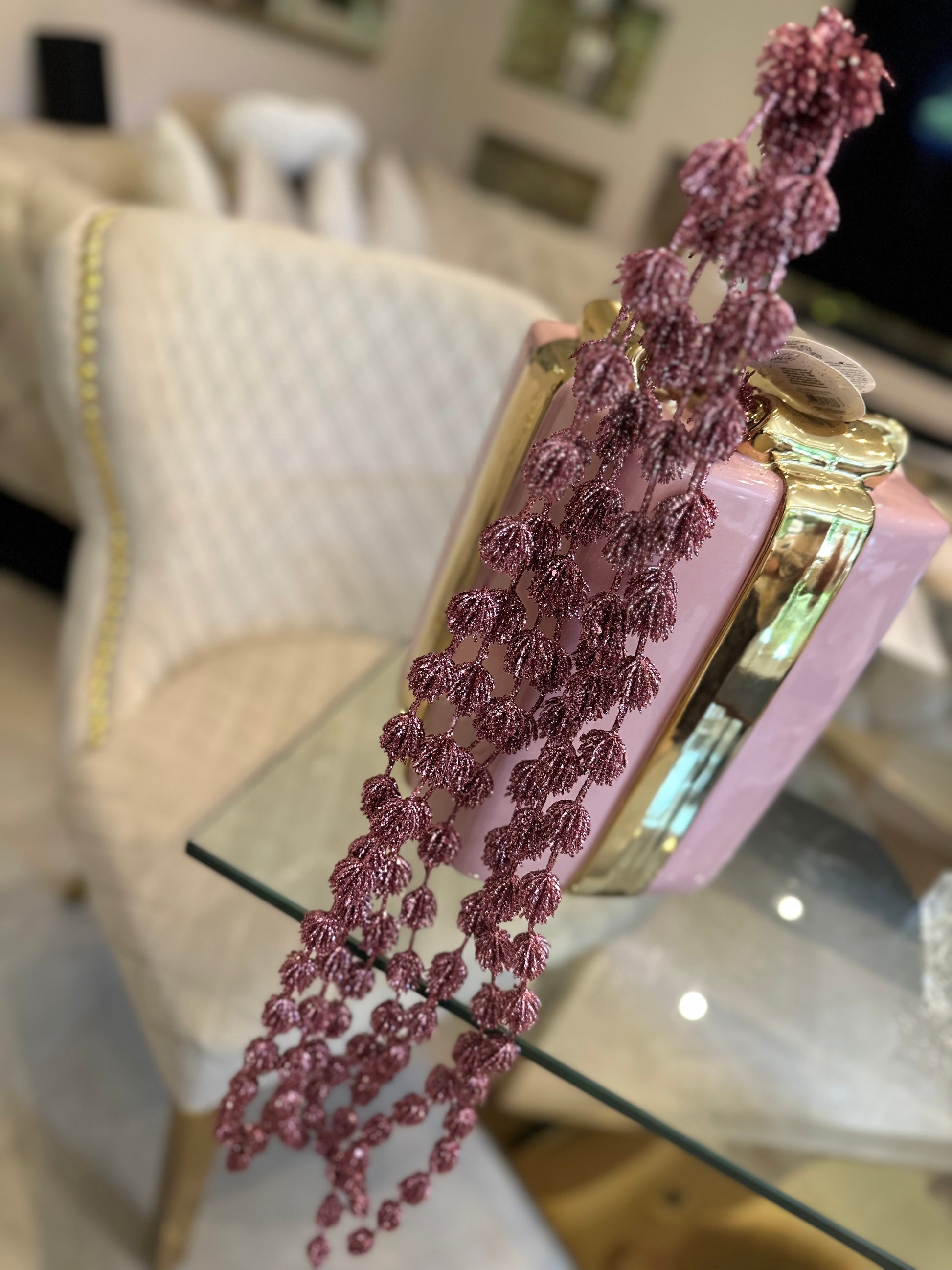 Die roséfarbenen Zweige, veredelt mit feinem Glitzer, fangen das Licht wunderschön ein und sorgen für eine festliche, edle Atmosphäre. Durch seine außergewöhnliche Farbgebung wird der Hängezweig zu einem modernen Hingucker, der sich sowohl mit klassischen Gold- und Silbertönen als auch mit festlichen Pastellfarben perfekt kombinieren lässt.