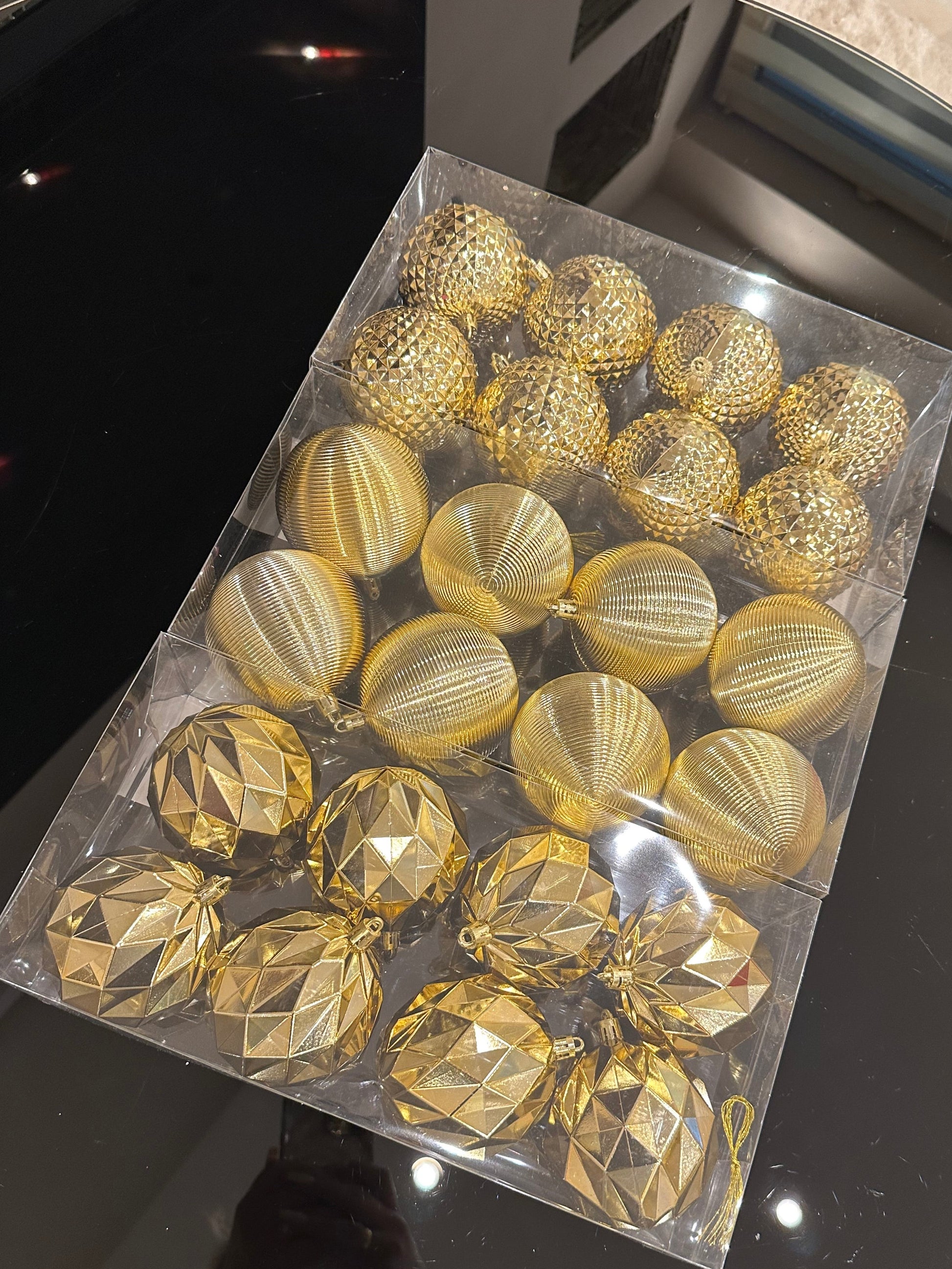 Die Kugeln sind in 3 verschiedenen Mustern gestaltet: von schlicht glänzend über elegant verziert bis hin zu glitzernden Designs. Diese Vielfalt sorgt für Abwechslung und Tiefe, während die einheitliche Goldfarbe ein luxuriöses, stimmiges Gesamtbild schafft.