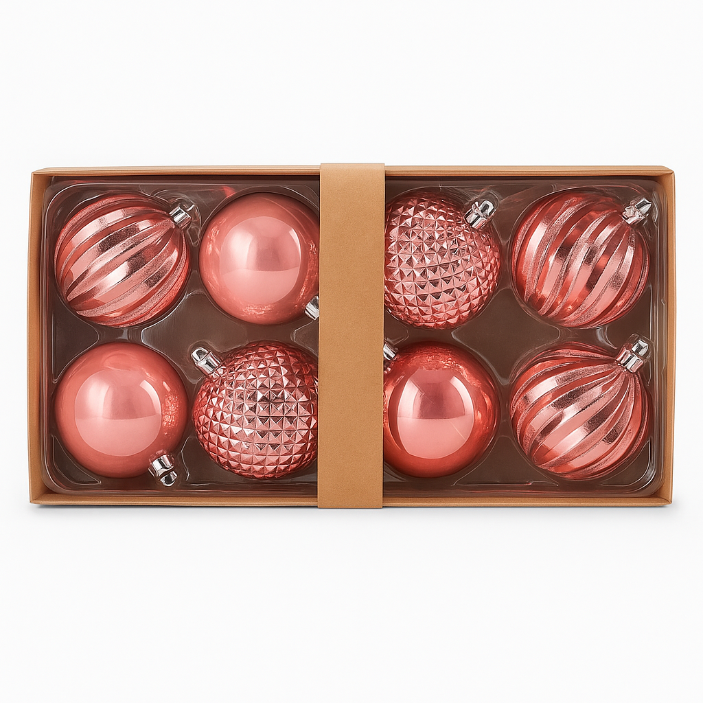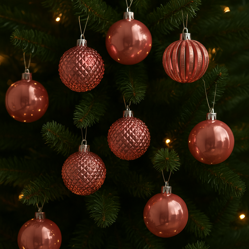 Die abwechslungsreichen Designs – von schlicht glänzend über fein verziert bis hin zu glitzernden Strukturen – schaffen ein harmonisches Gesamtbild mit moderner Note. Die zarte Rosafarbe lässt sich perfekt mit Gold, Weiß oder Silber kombinieren und verleiht Ihrem Baum einen eleganten, trendigen Look.