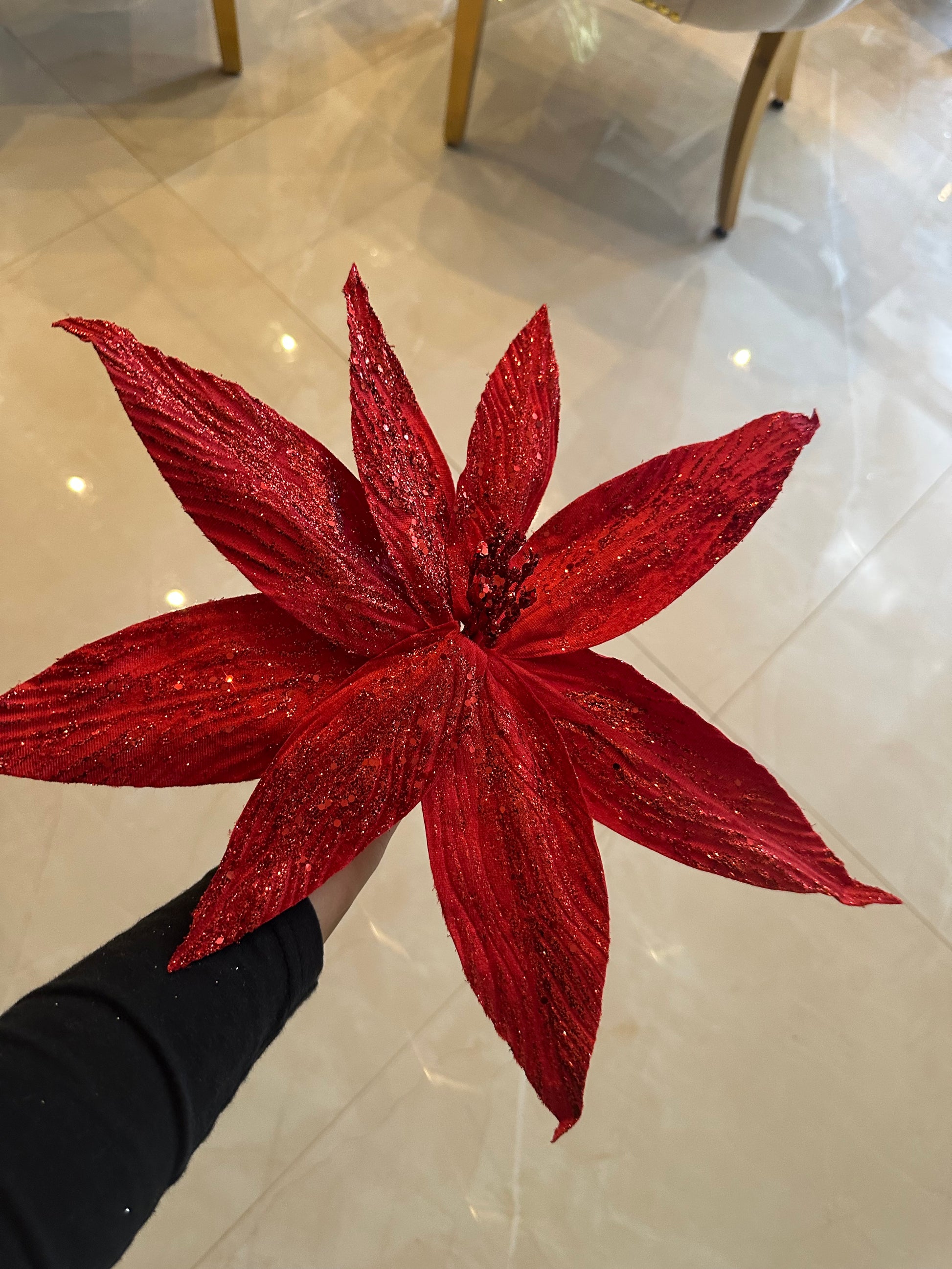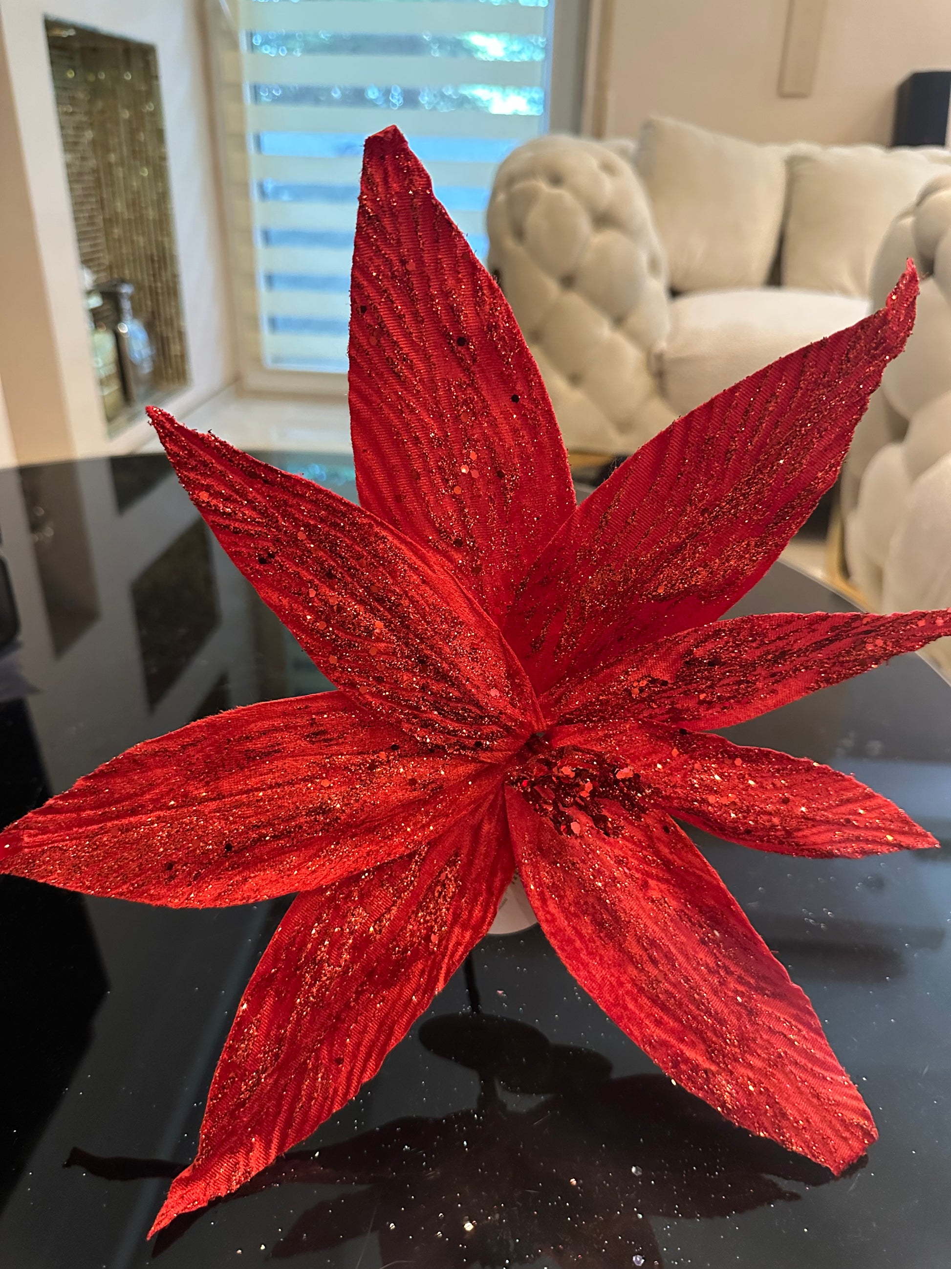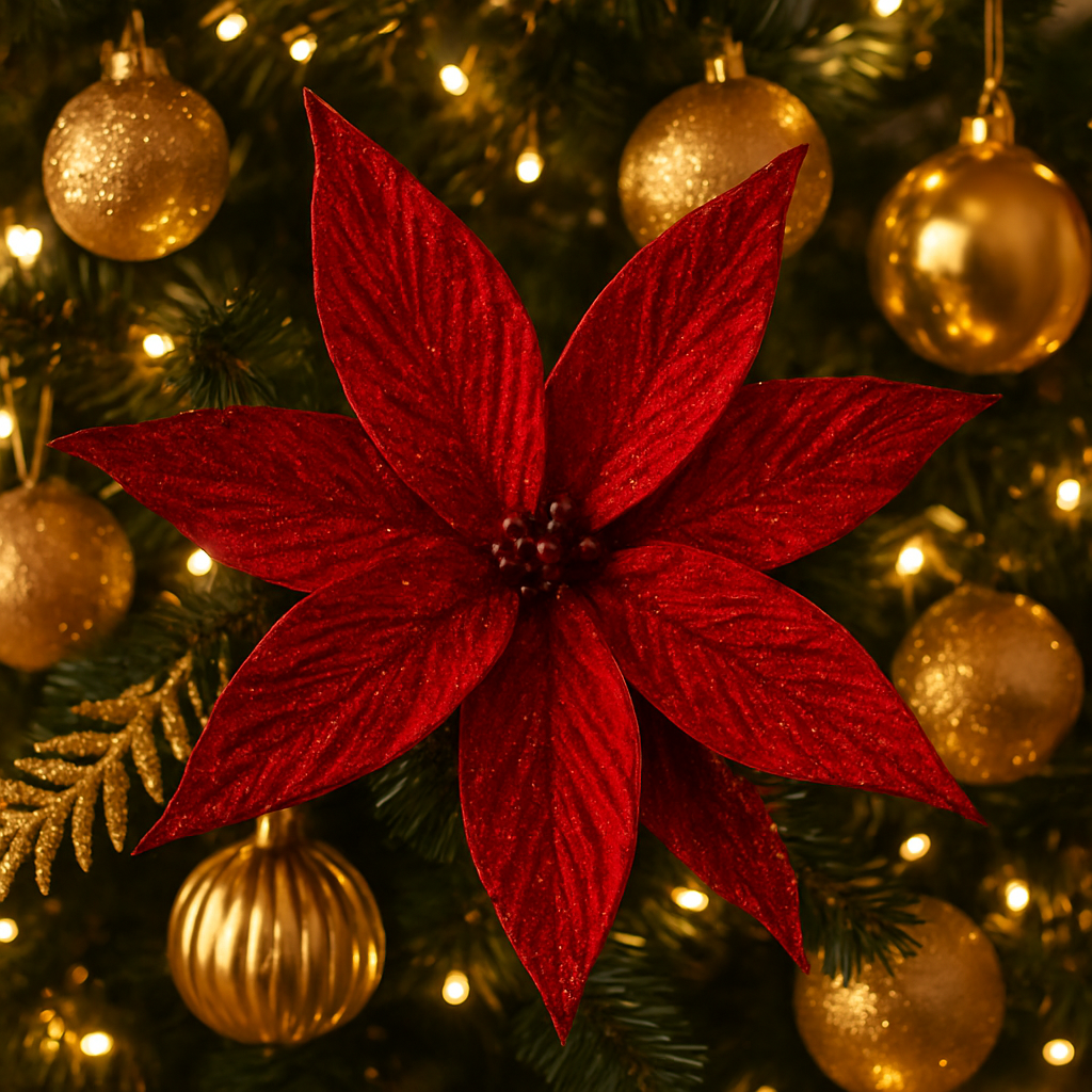 Die Kombination aus tiefroten, samtigen Blütenblättern und glänzenden Glitzerelementen verleiht diesem Weihnachtsstern eine besonders edle Ausstrahlung. Der samtige Stoff sorgt für eine warme, festliche Tiefe, während die glitzernden Highlights das Licht wunderschön reflektieren und für funkelnde Akzente sorgen.