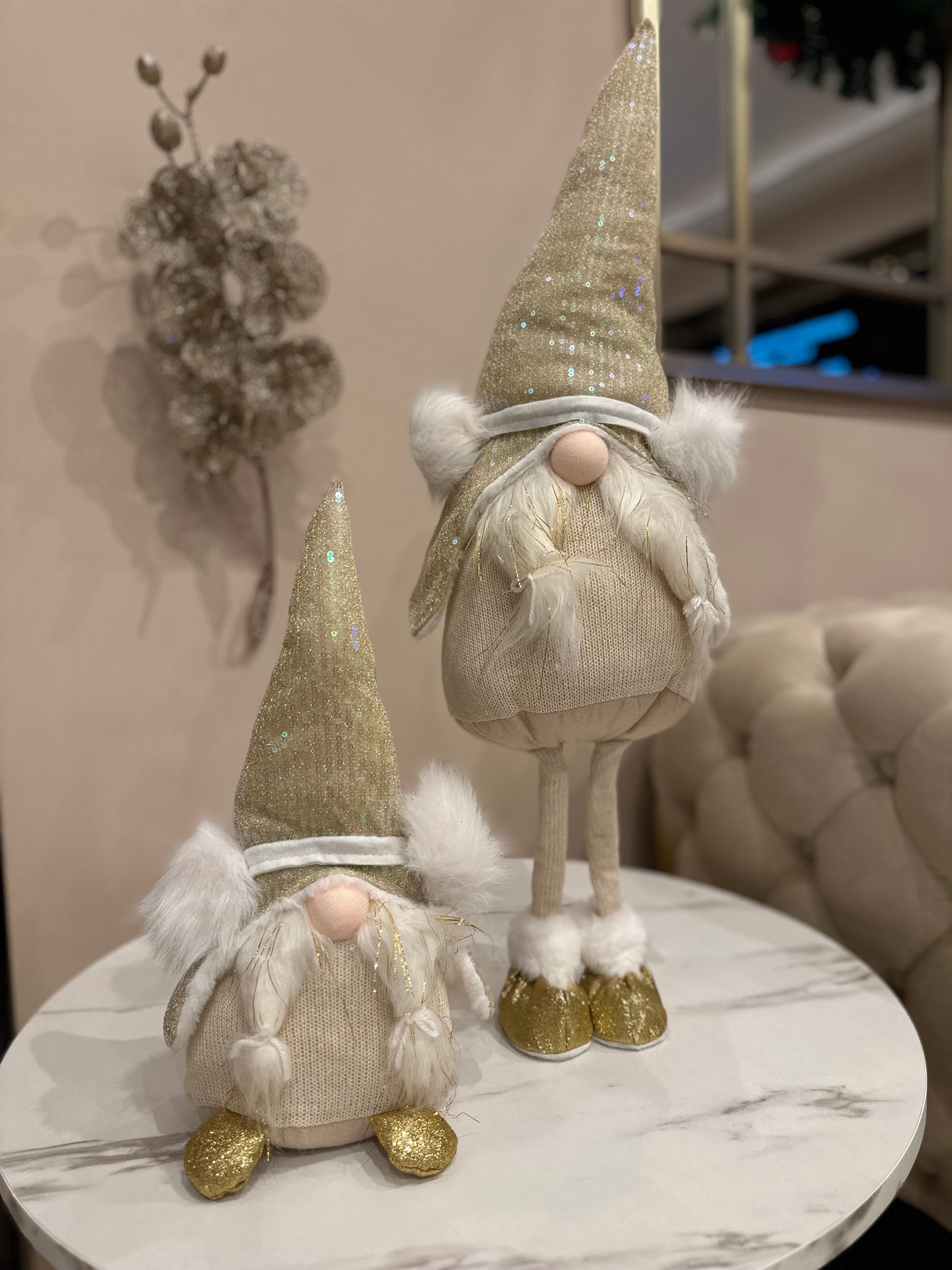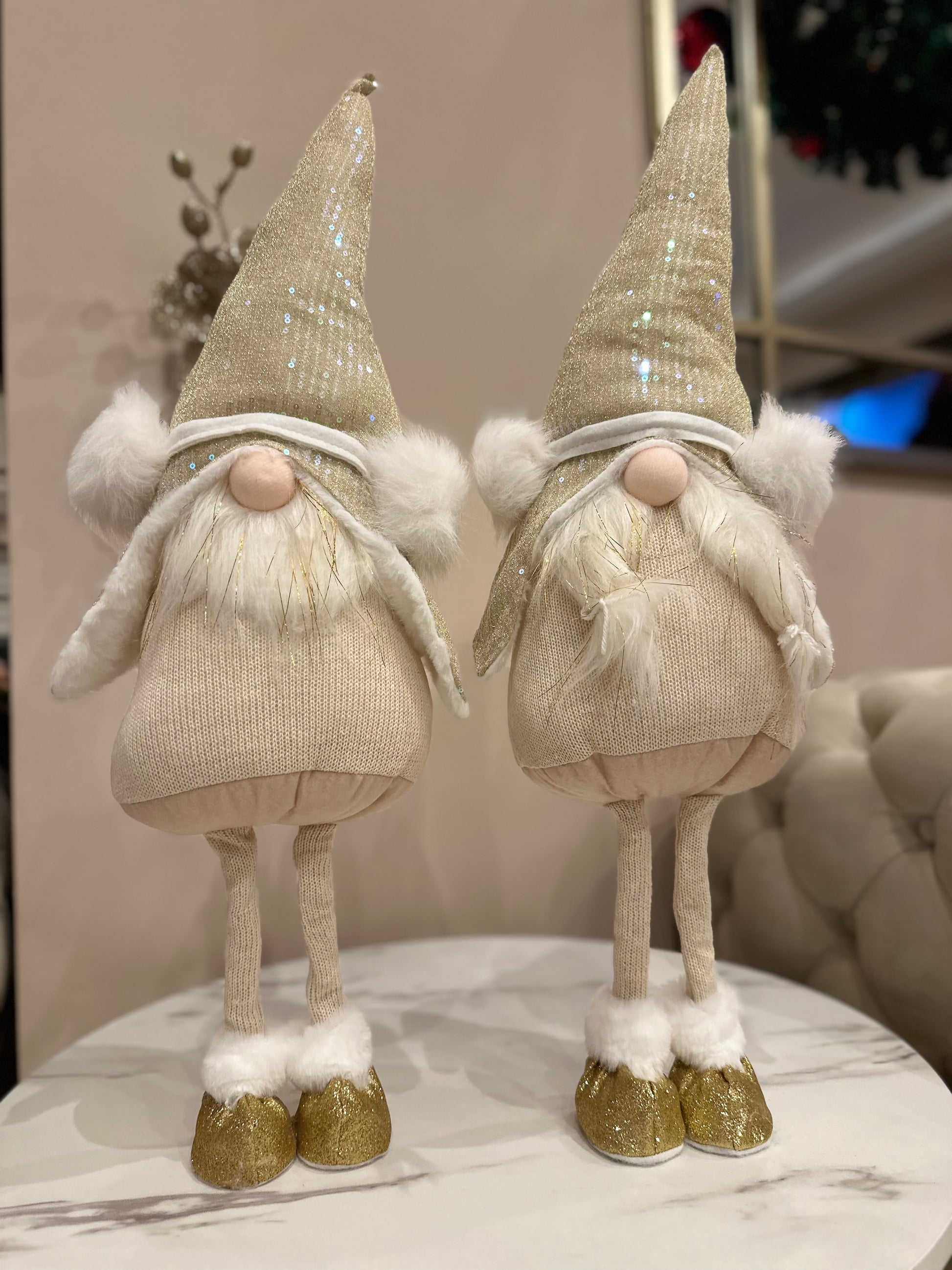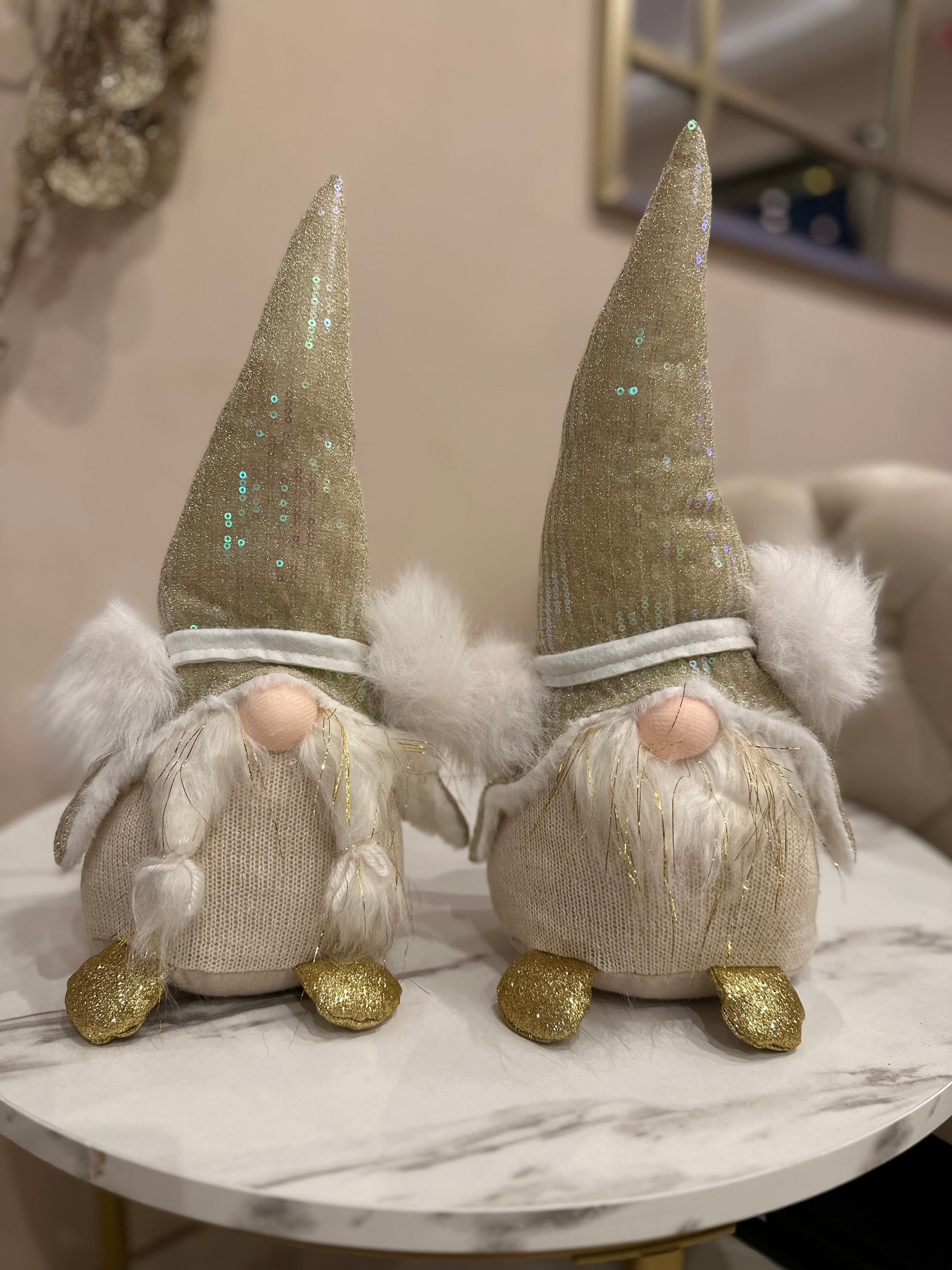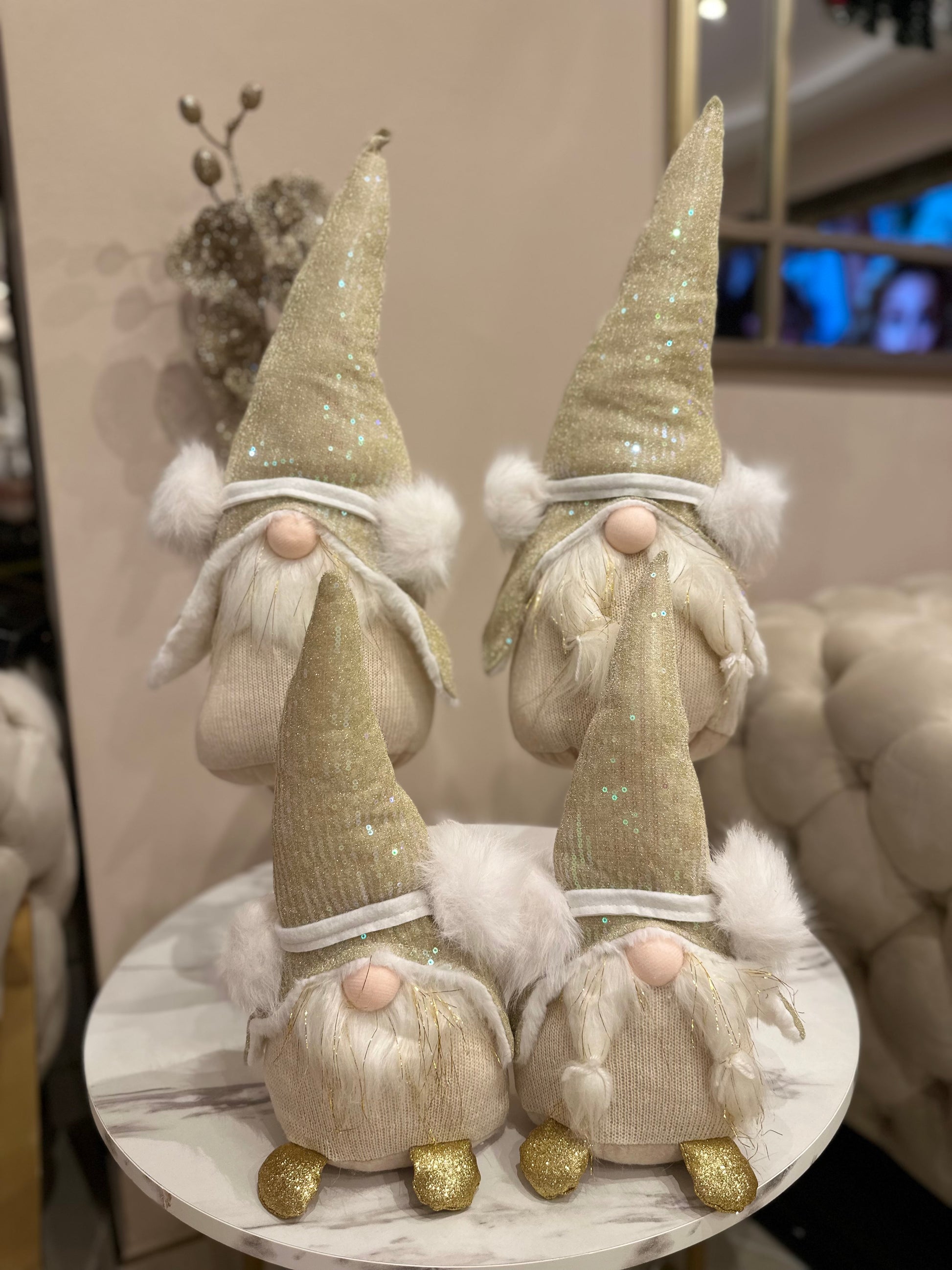 Die Wichtel bestehen aus hochwertigem Stoff mit Pailletten-Details, die im Licht wunderschön schimmern. Sie eignen sich perfekt für Sideboards, Fensterbänke, Kommoden, Tische oder den Eingangsbereich.